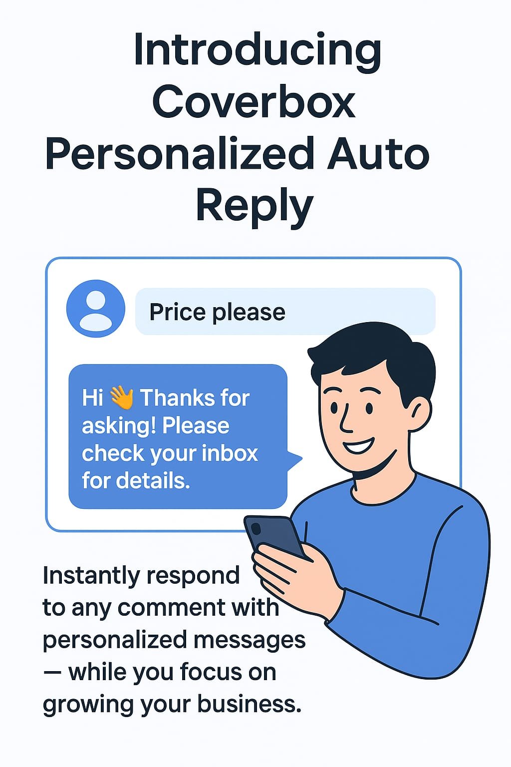 With Coverbox, you also improve your online performance instantly. It offers automatic comment replies. In addition, you get higher engagement, less manual work, faster lead capture, and 24/7 responsiveness — all in one simple and smart solution.